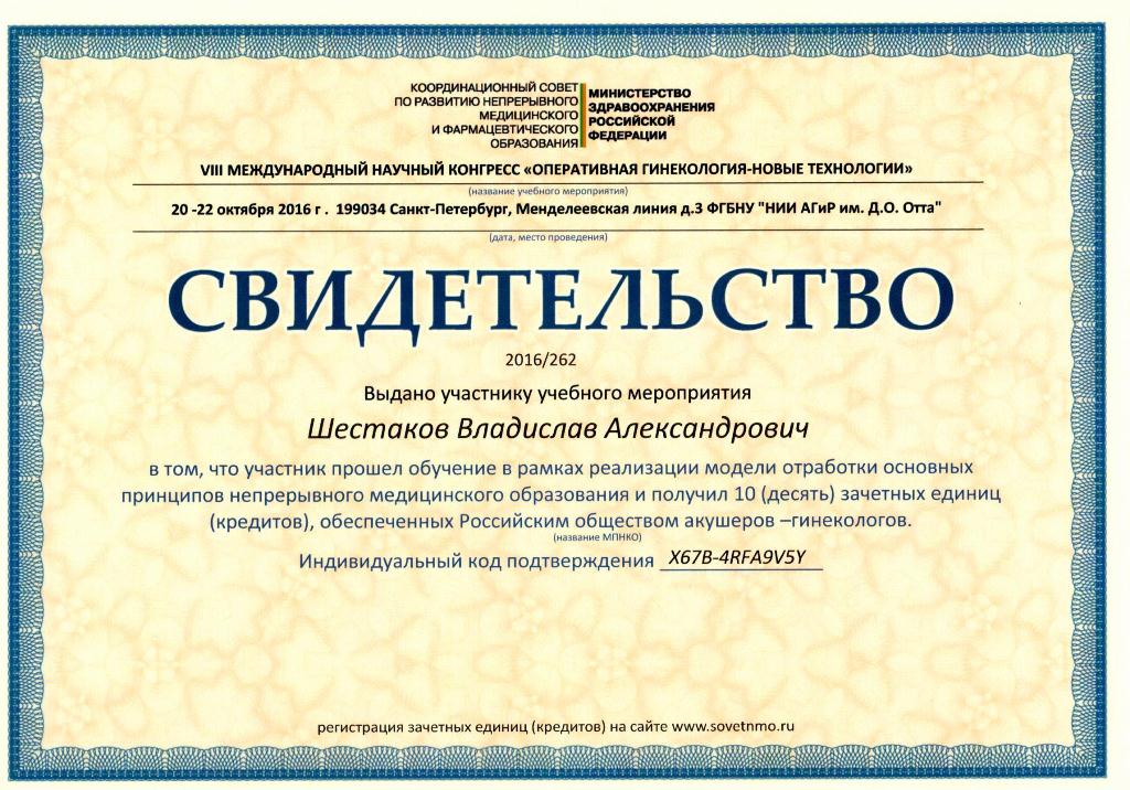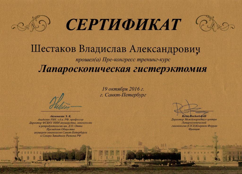 Московский Областной НИИ акушерства и гинекологии- "Диагностическая и оперативная гистеросокпия и лапароскопия. "Хирургия тазового дна" (2013 г.);НГМУ "Эндоскопия"(2014 г.).
