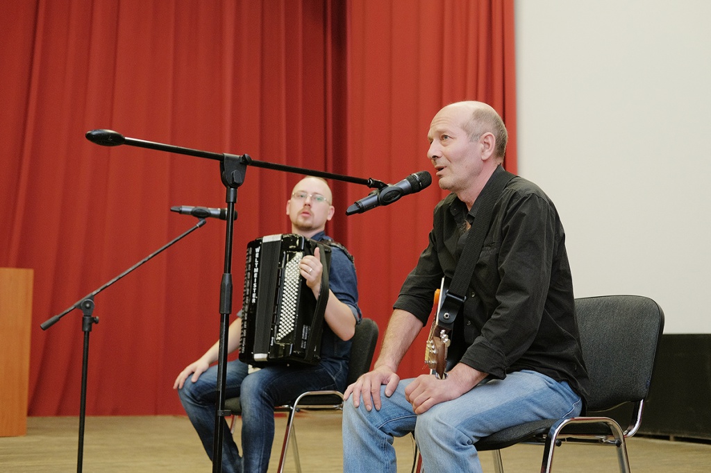 Перед пациентами и сотрудниками больницы выступили артисты театра «Красный факел» – Заслуженный артист России Николай Соловьев и Максим Мисютин. Пели песни о войне и просто о жизни и о любви. Были в программе и авторские песни Николая Соловьева.