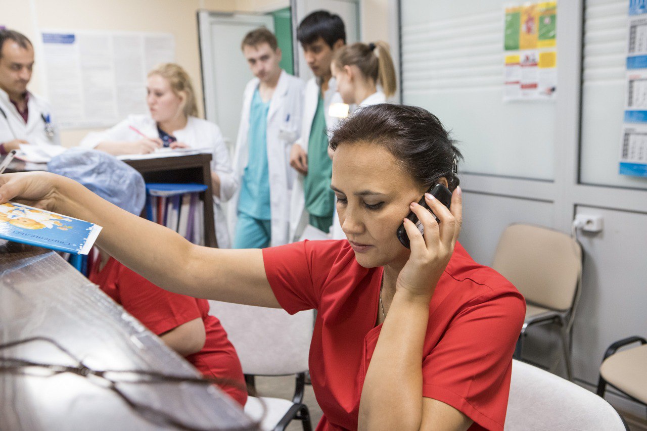 Одномоментно в приёмном отделении работают четыре медсестры, которые оформляют поступивших пациентов, сопровождают их по диагностическим и врачебным кабинетам, делают ЭКГ, берут кровь на анализы, делают уколы. Также здесь постоянно дежурят врачи: терапевт, ЛОР, офтальмолог, комбустиолог. При необходимости мы сразу вызываем из профильных отделений хирурга, травматолога, эндоскописта, невролога, уролога. Для постановки предварительного диагноза необходимо выполнить комплекс обследований и получить консультации специалистов. На это может уходить до двух часов и более.